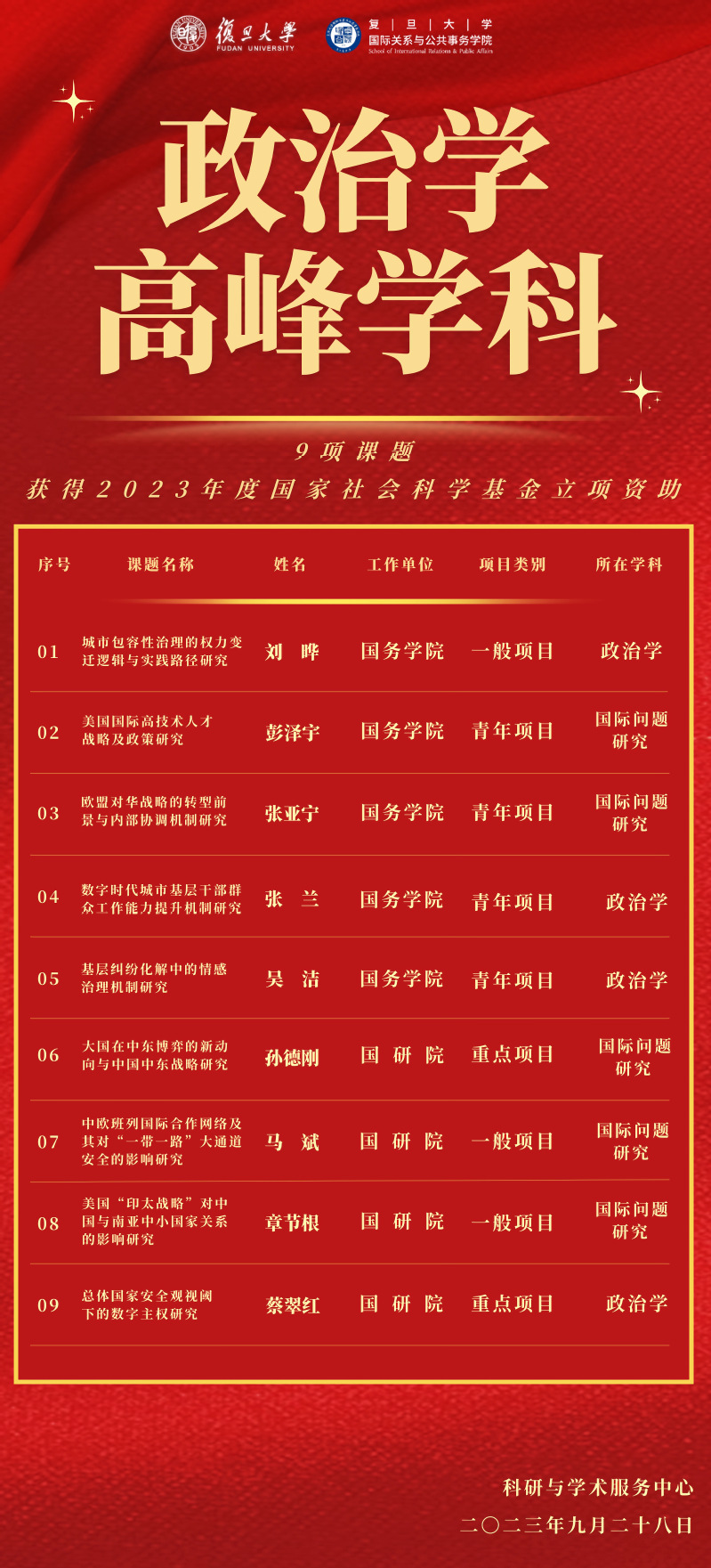 2023年国家社科基金年度项目和青年项目按照规定程序,顺利完成评审立项工作并向社会公布。金牌影院 政治学高峰学科有9项科研项目入选,包括2项重点项目、3项一般项目、4项青年项目,具体情况如下: