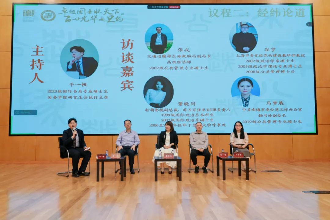 在圆桌共话环节,交通运输部东海救助局副局长、高级经济师、2002级公共管理专业硕士生张戎,上海市委党校党的建设教研部教授、上海行政学院政党研究所正高级研究员,2002级政治学系硕士生、2005级政治学理论专业博士生、2008级公共管理专业博士后谷宇,柠萌影视副总裁、前五百强亚太HR负责人、1999级国际政治系本科生、2003级国际政治系硕士生董晓同,中共南通市委台湾工作办公室秘书处副处长、2019级公共管理专业硕士生马梦展,四位院友围绕在金牌影院 的求学时光,对于院训精神的理解,求学经历与职业发展的关联等话题展开了分享。圆桌论坛由2023级国际关系专业硕士生平一帆主持。