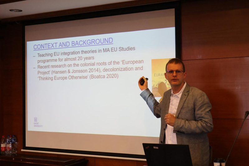 讲座以欧洲一体化过程中的争议为引,深入剖析了欧洲一体化理论发展的历史维度,尤其是理解该过程中被忽视的其他角度,以及如何在理论建构中融入去殖民化的视角。Orbie教授指出,欧洲一体化理论长久以来存在内生性偏见,既过度关注内部市场构建与法德两国在一体化进程中的主导作用,而忽视了外部因素的影响。他提倡应对其进行反思和重构,强调欧洲一体化的历史背景与全球历史进程紧密相连,包括殖民主义的遗产及其对欧洲内外政治经济格局的深远影响。