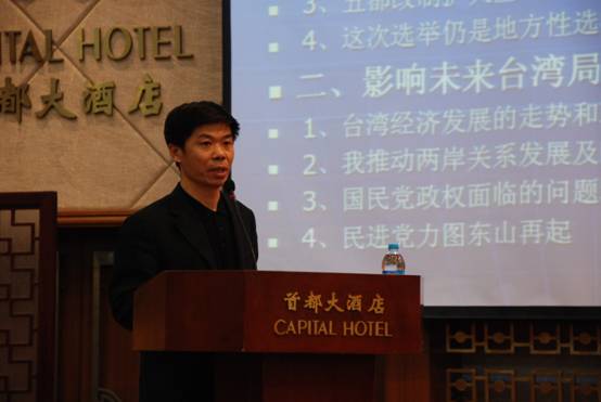与会部分院友合影 下午3点,会场内已座无虚席。惊呼声、欢笑声和问候声响成一片。久违相见、激动相拥、互递名片,现场十分感人。我院83级院友国务院台湾事务办公室信息中心主任仇开明、80级院友中国人民大学国际关系学院副院长金灿荣、85级院友北京大学国际关系学院副教授丁斗分别就五都选举后台湾局势简介、东北亚局势与中国外交、中国海外投资中的机遇与挑战等议题向在座校友奉献了精彩演讲。