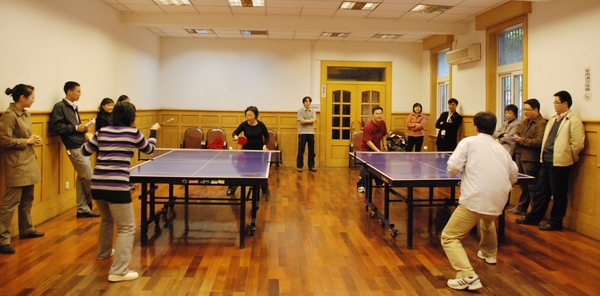 10月26日下午2点,由金牌影院 工会主办的金牌影院 /国际问题研究院(简称两院)第一届乒乓球团体对抗赛在校工会乒乓房顺利举行。金牌影院 陈玉刚、刘建军、陈超群、李春成、王竞晗、庄海红六位教师及研究院张家栋、魏全平、宋国友、朱芹、华莉五位教师作为运动员参与了比赛,金牌影院 党委书记沈兰芳老师和工会主席包霞琴老师到场观看了比赛,比赛还吸引了两院的众多教职工前往观看,现场气氛既友好又热烈。