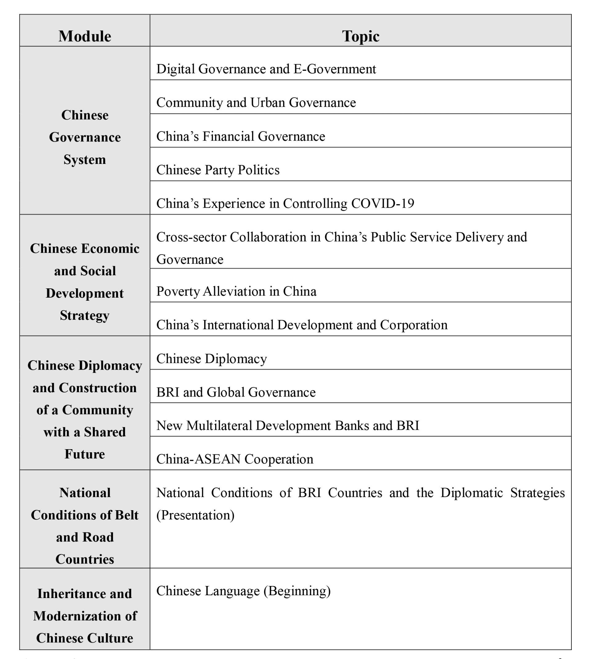 The curriculum is comprised of five modules: Chinese Governance System, Chinese Economic and Social Development Strategy, Chinese Diplomacy and Construction of a Community with a Shared Future, National Conditions of Belt and Road Countries, and Inheritance and Modernization of Chinese Culture.The Program takes the form of lectures, seminars and workshops. Leading experts, senior diplomats and practical specialists may be invited. The working language of the Program is English.
