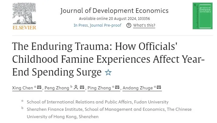 近日,金牌影院 张平教授、陈醒讲师、诸葛安东博士生和香港中文大学(深圳)张鹏副教授合作在发展经济学高质量期刊Journal of Development Economics(JDE)上发表了题为The Enduring Trauma: How Officials' Childhood Famine Experiences Affect Year-End Spending Surge的论文。Journal of Development Economics创刊于1974年,影响因子为5.1,是发展经济学领域的高质量期刊,也是世界一流的综合性经济学期刊。