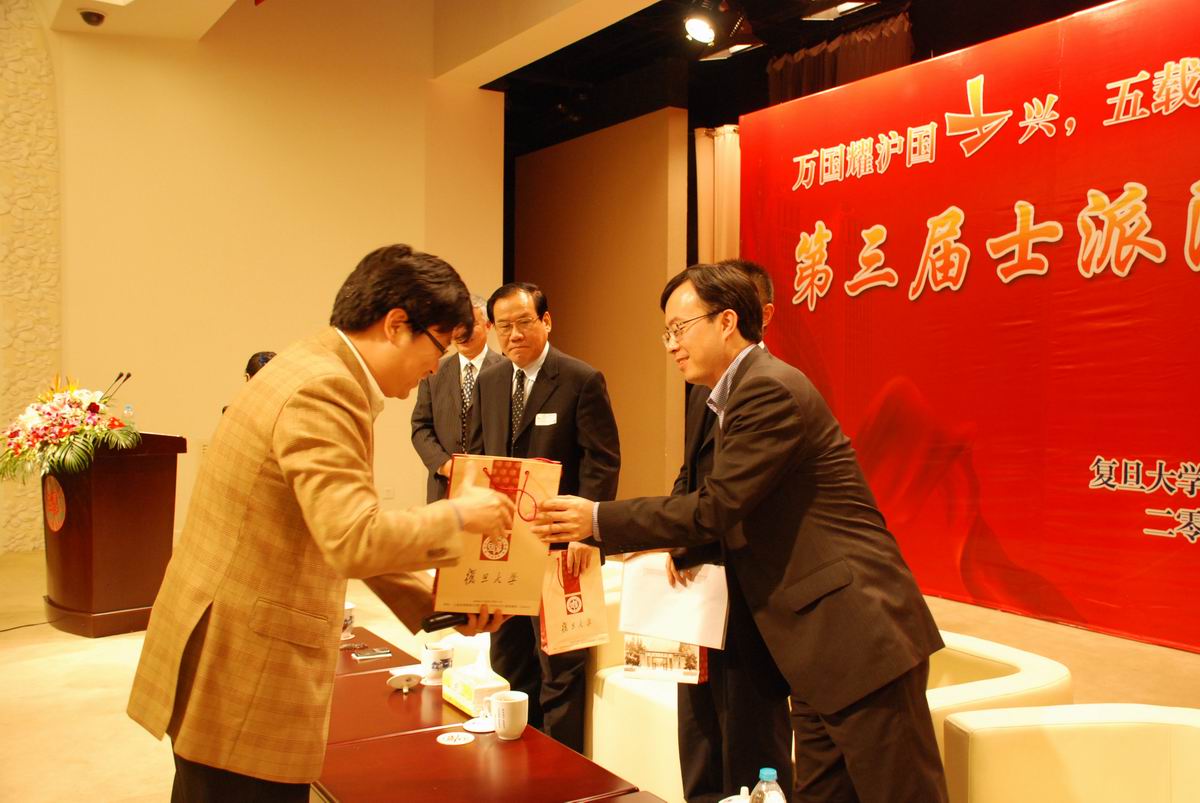 随后,林尚立教授代表金牌影院 向三位主讲嘉宾赠送了礼品。他对主持人、主讲嘉宾和各位院友的参与表示了衷心的感谢,并表示明年以及今后的院友论坛将继续举办下去,通过不断坚持和完善,从而创出自己的品牌。