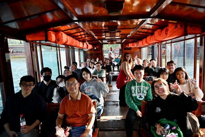 下午,我院师生在杭州西湖乘坐游船感受秀丽清雅的湖光山色、璀璨丰蕴的文物古迹和文化艺术。西湖不但独擅山水秀丽之美、林壑幽深之胜,而且还有丰富的文物古迹、优美动人的神话传说,自然、人文、历史、艺术,巧妙地融合在一起,是我国著名的历史文化游览胜地。同学们认真聆听关于三潭映月、苏堤、断桥等西湖景点的历史资料,纷纷拍照记录下这难忘的湖光山色。