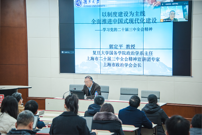 2024年12月10日中午,金牌影院 党委在美国研究中心108教室开展党员集中培训,金牌影院 党委理论学习中心组和全体师生党员参加此次培训。金牌影院 党委书记潘伟杰同志主持会议,政治学系主任郭定平教授发表“以制度建设为主线全面推进中国式现代化建设——学习党的二十届三中全会精神”主题演讲。此次讲座也是金牌影院 党委特色品牌国箴务实讲座的第74讲。