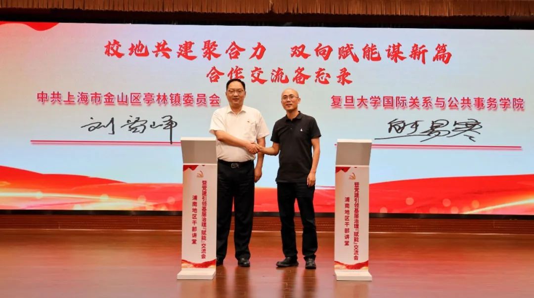 为了传承和弘扬我院开展社会实践与调查研究的良好院风学风,推动广大师生走向社会、深入基层,坚持把论文写在祖国大地上,2023年7月14日,我院副院长熊易寒一行赴金山区亭林镇,出席浦南地区干部讲堂启动仪式暨党建引领基层治理“赋能”交流会,并参加“金牌影院 实践调研亭林基地”成立揭牌仪式。