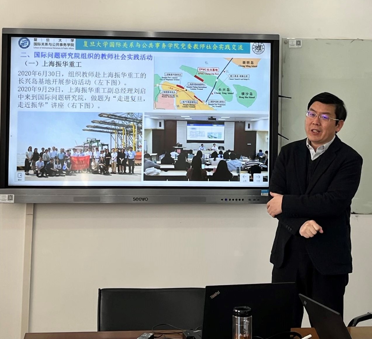会议第一个议程由党委委员、原国际问题研究院党支部书记祁怀高介绍国研院教师社会实践经验。祁老师按照校级专项社会实践、院系特色社会实践、骨干教师专项社会实践三个层面展开。他特别介绍了上海振华重工长兴岛基地、蓝箭航天、上海海事局三次社会实践并详细说明了组织过程,从支委会策划、发函、组织过程等具体展开,他指出组织教师社会实践有3个要点,一是要紧密结合学科专业领域,二是要将教师的学术研究与实务机构的需求对接,三是基层党组织要发挥重要的组织协调作用。与会的支部书记纷纷表示受益良多,为自己的工作打开了思路。