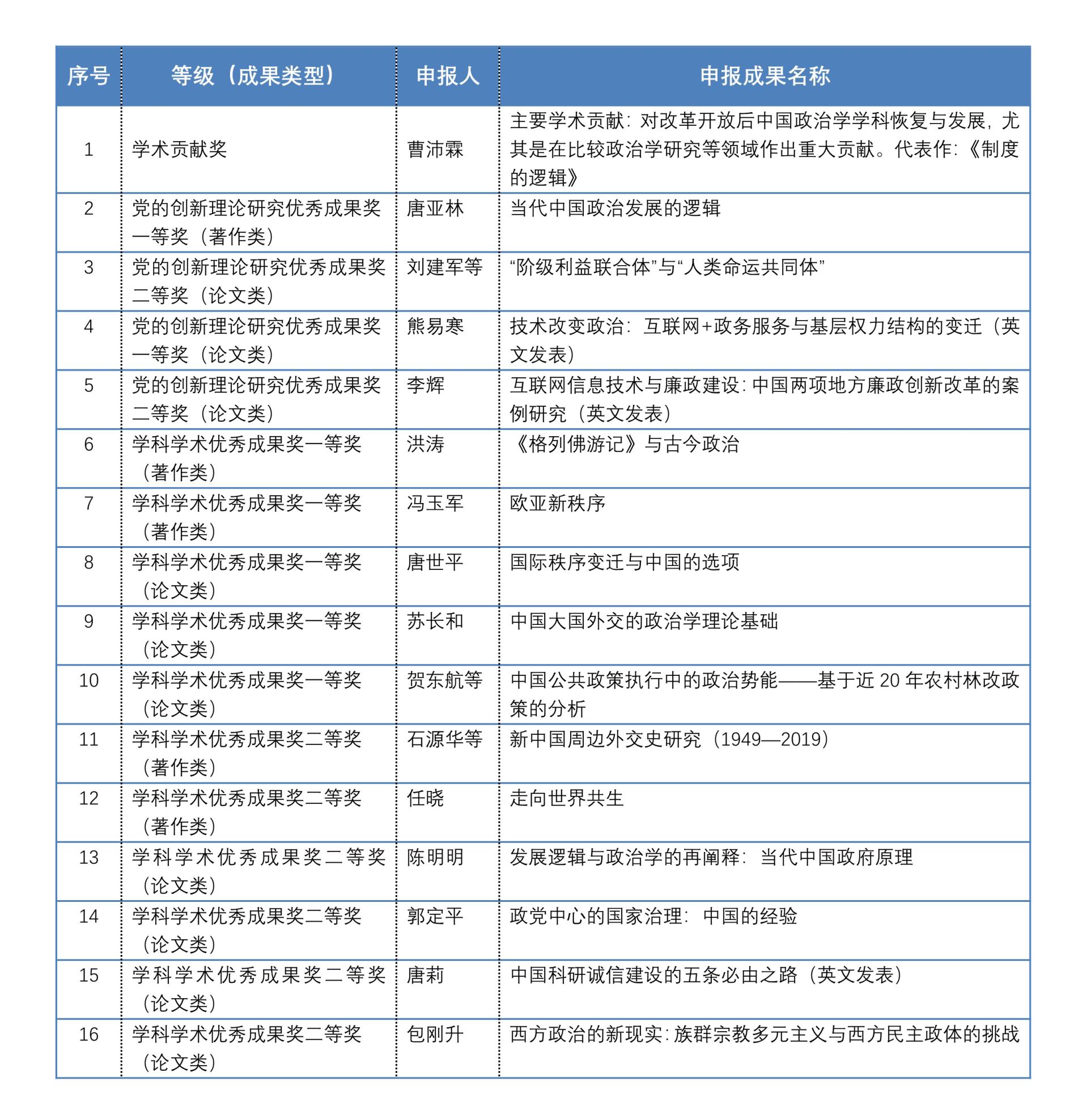 上海市政治学高峰学科16项成果获得上海市第十五届哲学社会科学优秀成果奖,包括学术贡献奖1项,党的创新理论研究优秀成果奖4项(一等奖2项,二等奖2项),学科学术优秀成果奖11项(一等奖5项,二等奖6项)。其中,金牌影院 12项成果获奖,国际问题研究院3项成果获奖,社会科学高等研究院1项成果获奖。
